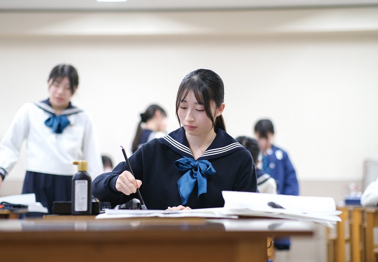 中学ではまず基本の筆使いを学び、文字を正しく整えて書くことを目指します。高校では中国や日本に伝わる様々な書の美しさや技法に触れ、その成立の背景なども見つめながら、書を多様な角度から味わい表現する楽しさを学びます。