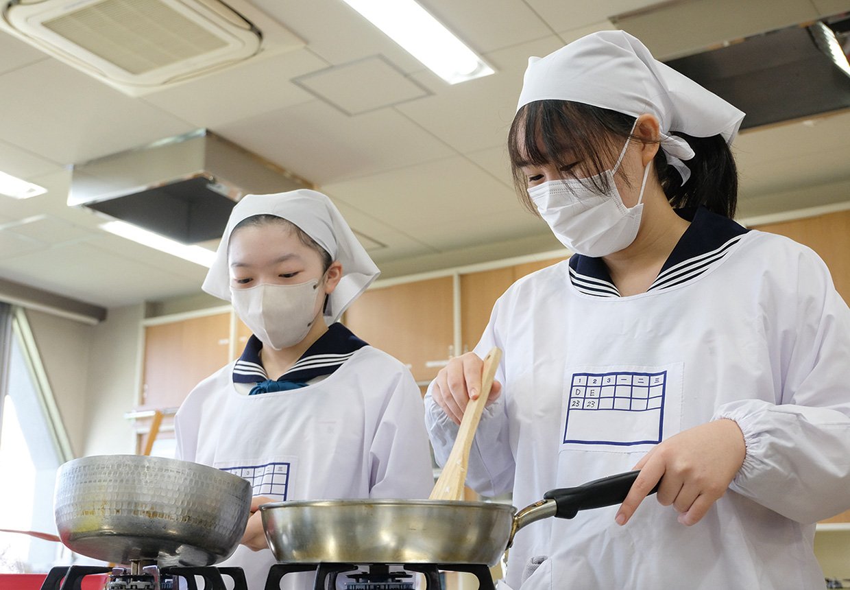 実習や製作を多く取り入れ、手提げバッグ・ハーフパンツ製作やフランス刺繍を実践し、実生活で活かせる知識を習得します。楽しさや完成時の達成感も得られるよう、実技指導を丁寧に行います。高二・高三の選択授業では、伝統的な和食や郷土料理・世界の料理・被服(浴衣ほか)などの発展的な内容を扱っています。