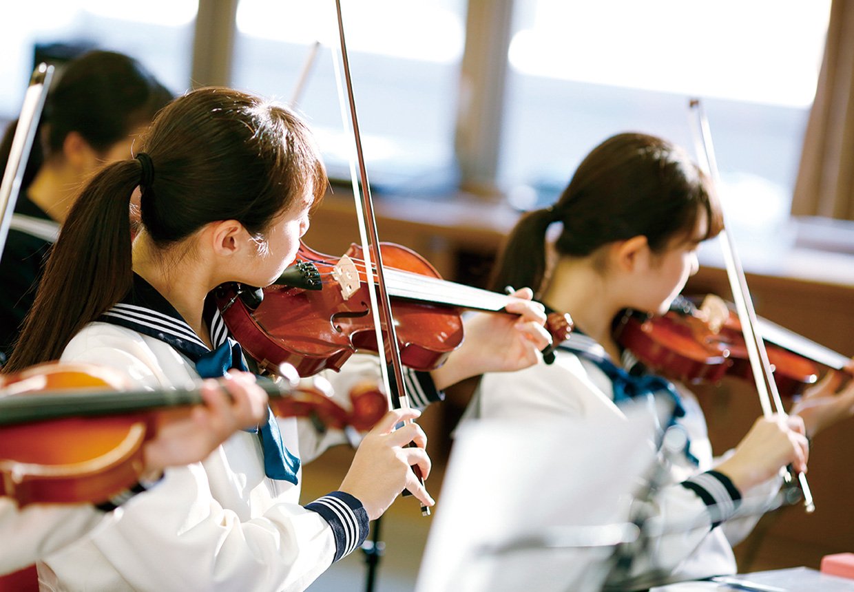 中学では自然で無理のない発声を身につけ、ハーモニーをつくる楽しさを経験します。高校ではギターやヴァイオリンの基礎的な奏法に加え、広い視野をもって芸術を捉える考え方も学びます。鑑賞行事「音楽会」では世界的に活躍する演奏者をお招きし、感性を磨きます。