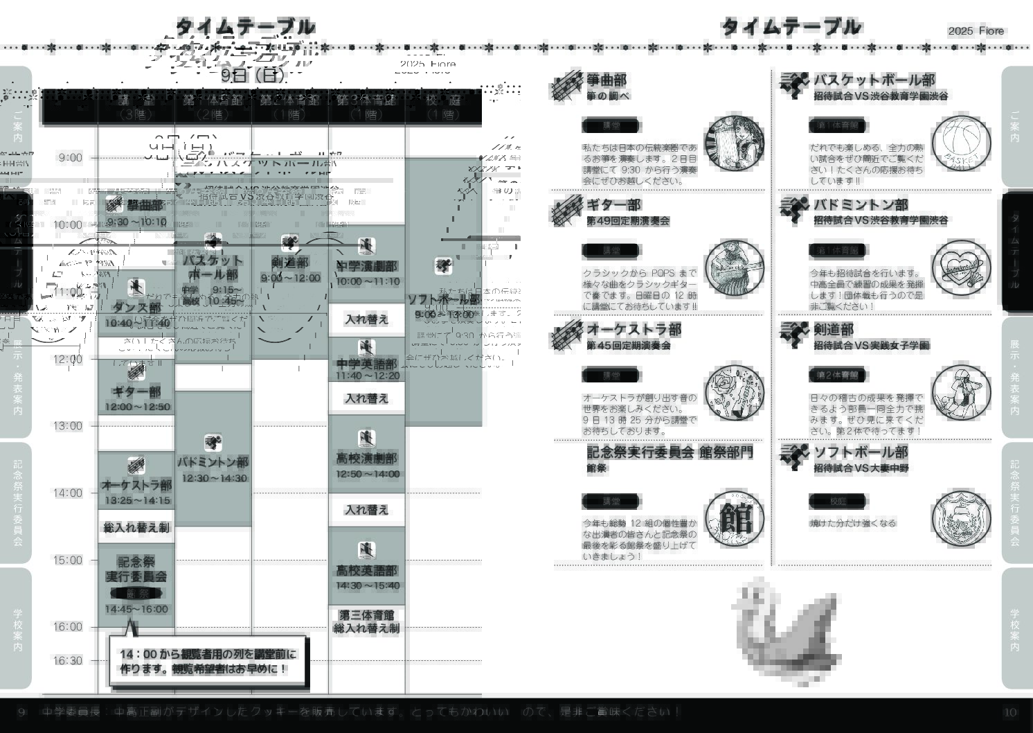 文化部の舞台・演奏・展示発表、運動部の招待試合、各委員会や有志による展示発表のほか、記念祭実行委員会が主催するイベントなど、たくさんの方にお楽しみいただけるプログラムをご用意しています。