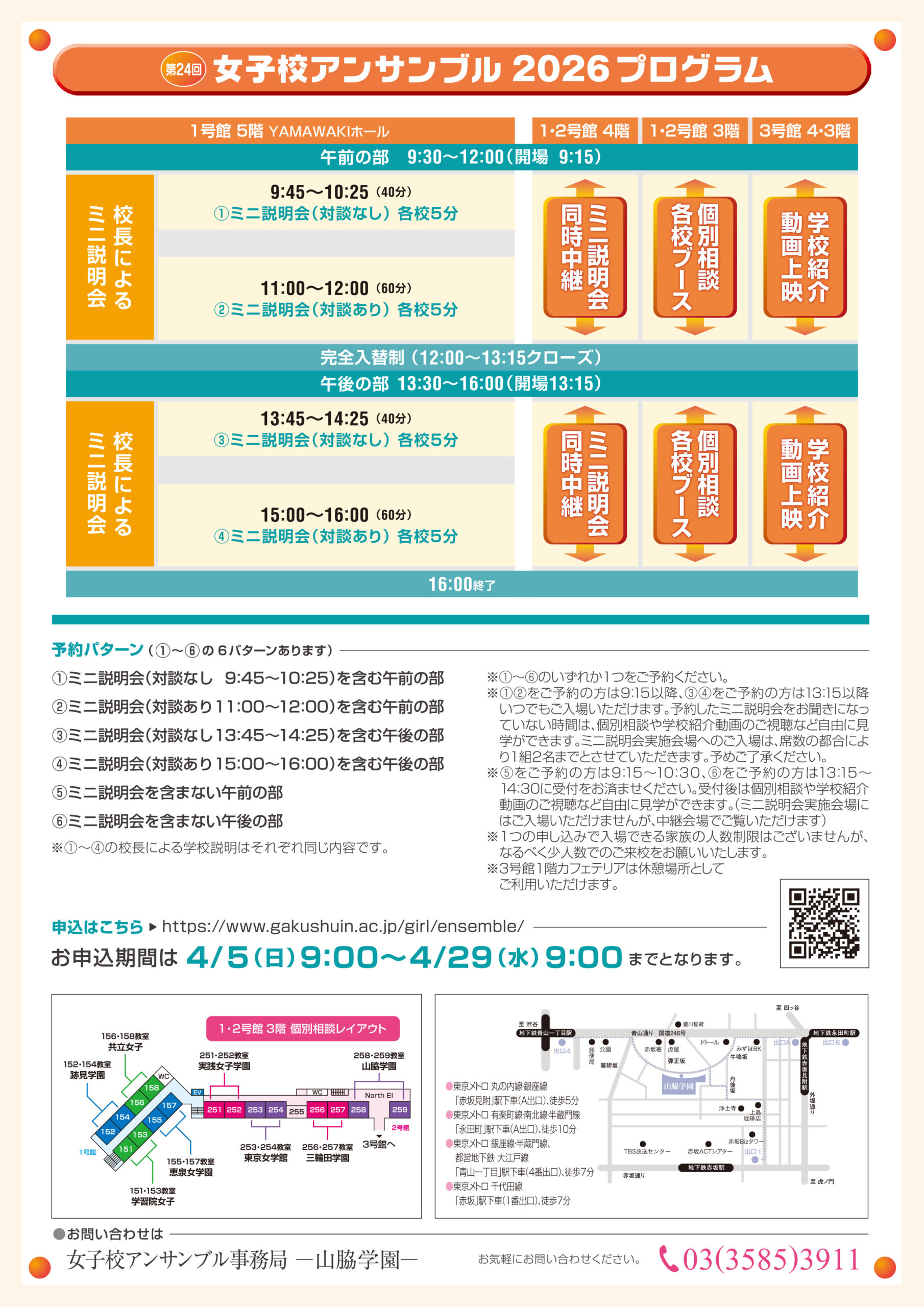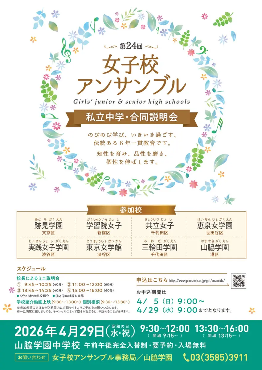 2026年4月29日(水・祝)9:30~16:00、第24回を迎える私立女子中学合同説明会「女子校アンサンブル」(於 山脇学園)に参加いたします。 事前のお申し込みが必要です。お申し込みの受付は4月5日(日)9:00より開始です。詳細とお申し込み方法は、以下の特設サイトをご覧ください。